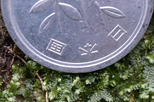 葉は長さ1~1.7㎜、幅0.6~1㎜の舌形で、葉先に歯が3個ある。 1円玉の直径は20㎜。外縁部分の幅は測定してみると約1㎜。 写真の1円玉外縁部分と比較しても葉の長さは、ほぼ同じ。 |