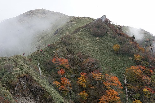 縦走路から次郎笈、紅葉と曇る笹山 |