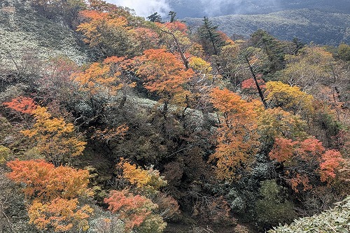 先週歩いた石鎚山は紅葉が少なく、枯れ葉色の目立つ状態で、今年の猛暑の影響かと思われた。